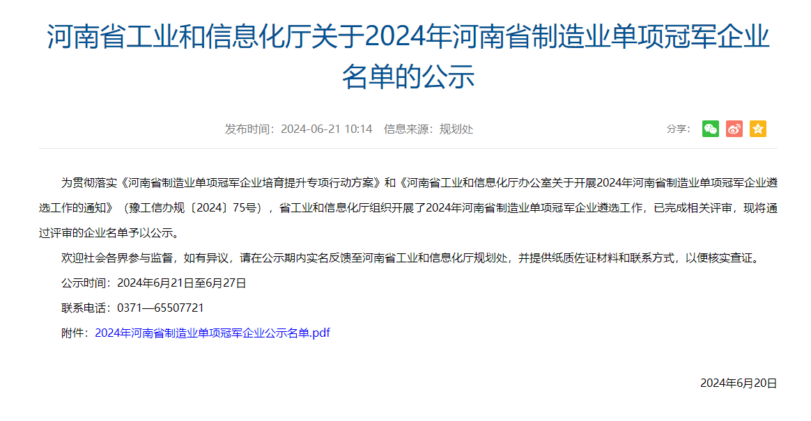 近日,河南省工業(yè)和信息化廳公示2024年河南省制造業(yè)單項冠軍企業(yè)名單,河南通達電纜股份有限公司成功獲評。
