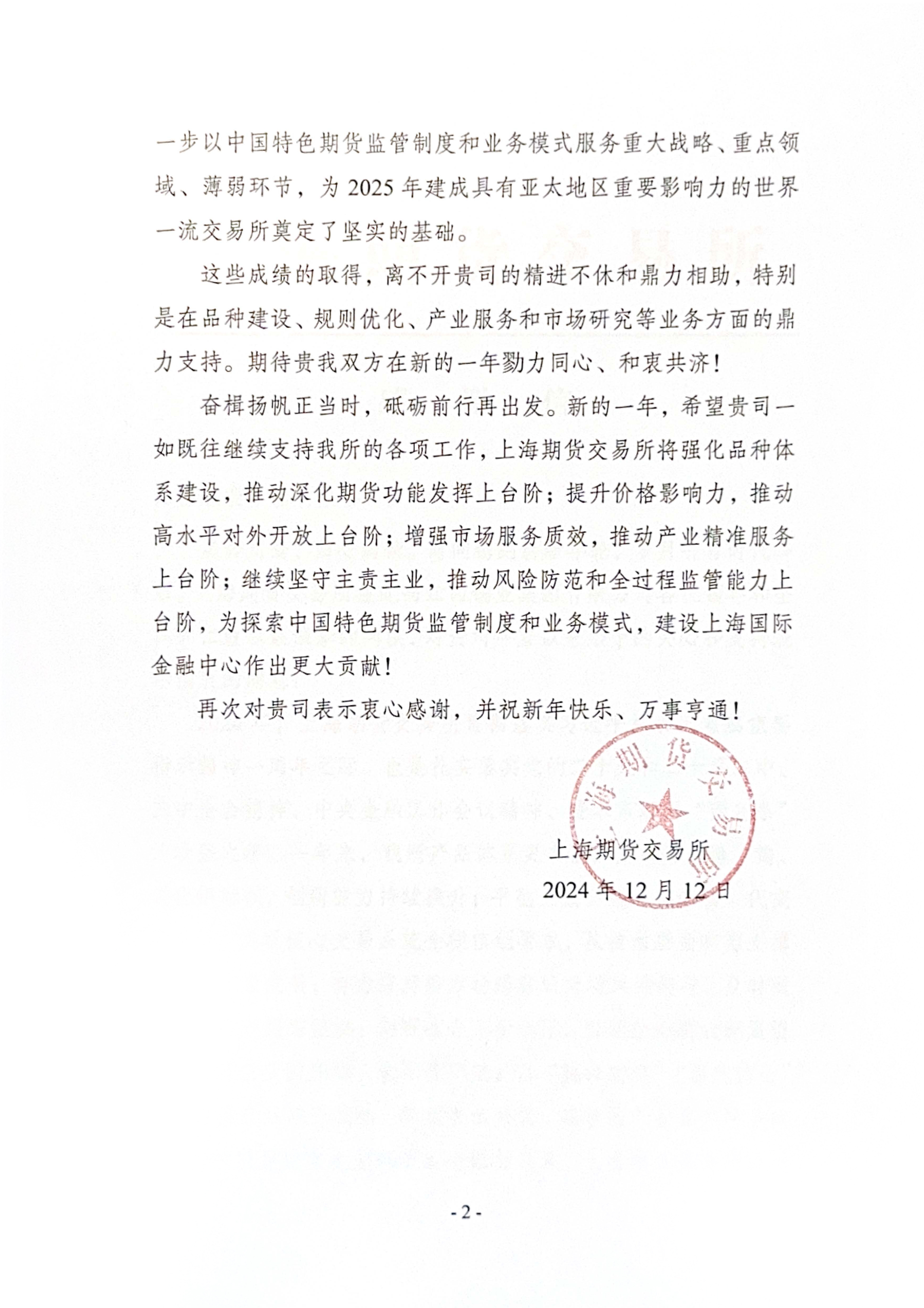 近日,通達股份收到上海期貨交易所發(fā)來的感謝信,信中對公司在品種建設、規(guī)則優(yōu)化、產業(yè)服務和市場研究等方面的業(yè)務支持給予了高度評價和衷心感謝,并表示期待雙方在新的一年勠力同心、和衷共濟!