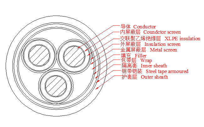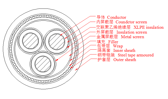 3.6/6~26/35kV三芯交聯(lián)聚乙烯絕緣鋼帶鎧裝電力電纜產(chǎn)品結(jié)構(gòu)示意圖