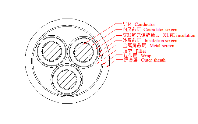 3.6/6~26/35kV三芯交聯(lián)聚乙烯絕緣電力電纜產(chǎn)品結(jié)構(gòu)示意圖