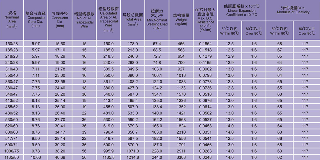 JRLX/T(ACCC/TW)碳纖維復合芯導線性能參數(shù)