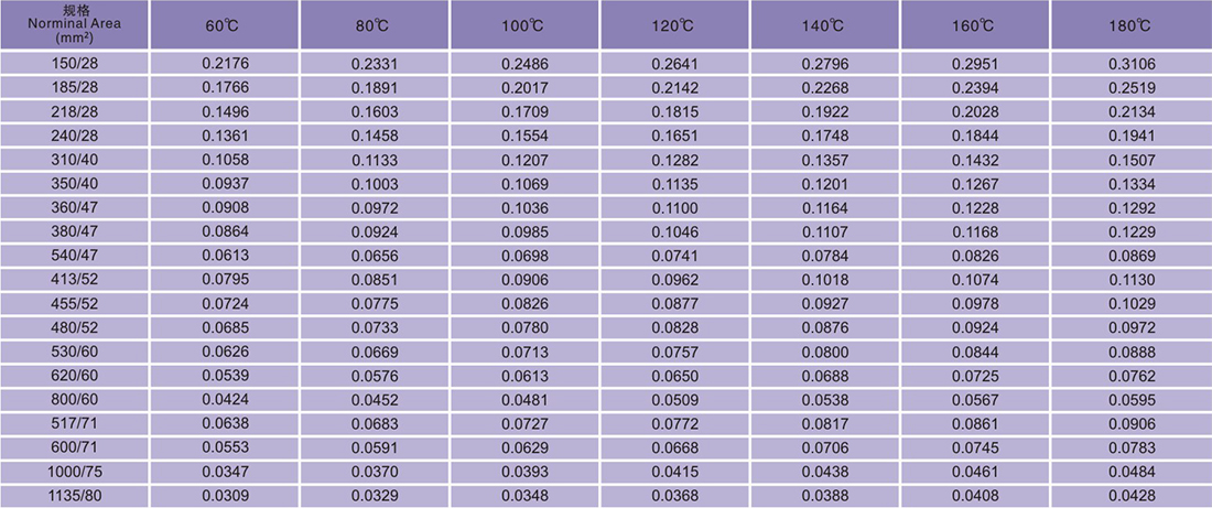 JRLX/T(ACCC/TW)碳纖維復合芯導線交流電阻表(Ω/km)