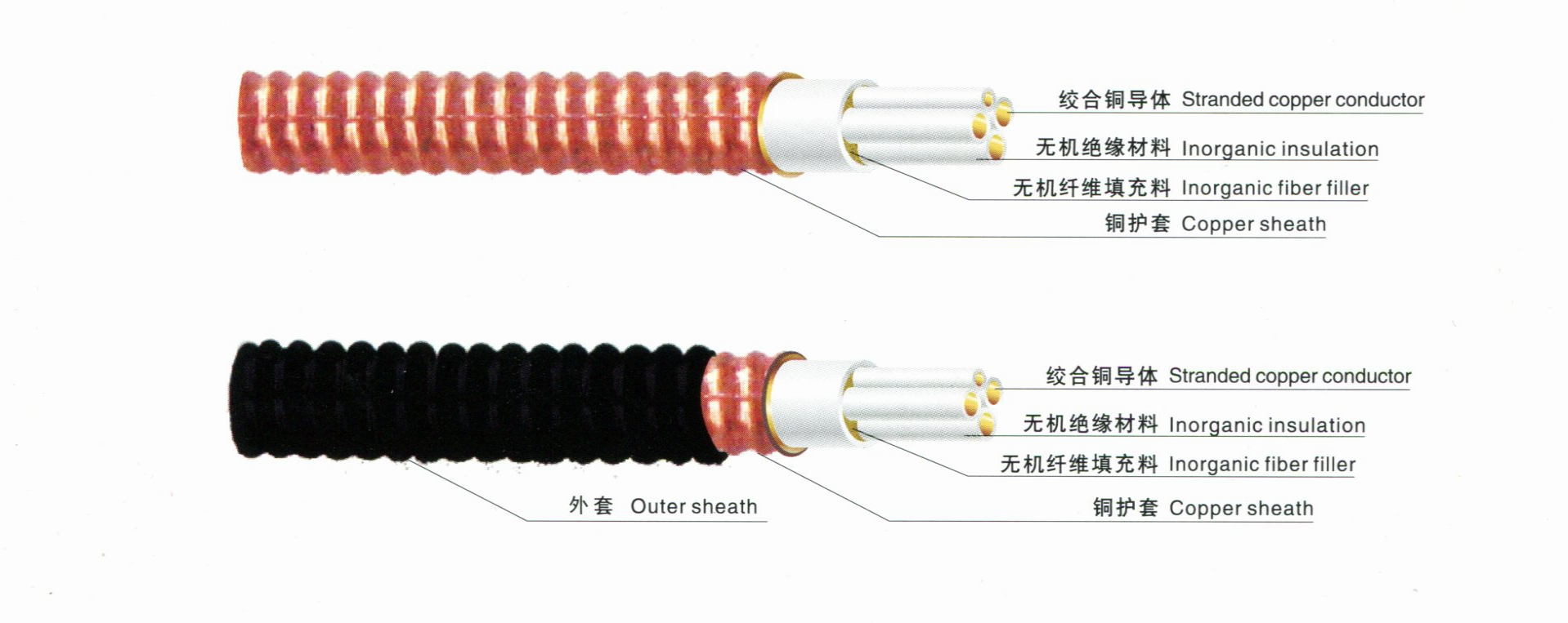 該種電纜采用退火軟銅作導(dǎo)體,導(dǎo)體由一根或多根退火銅絲絞合緊壓而成,導(dǎo)體絕緣、成纜繞包采用滿足A級(jí)耐火等級(jí)的無(wú)機(jī)礦物材料。護(hù)套采用不銹鋼帶或者軟銅帶經(jīng)過(guò)縱向包覆、焊接、軋紋而成,該種電纜具有無(wú)煙無(wú)鹵不燃和耐火特性,滿足防火要求較高的特殊場(chǎng)合需求。