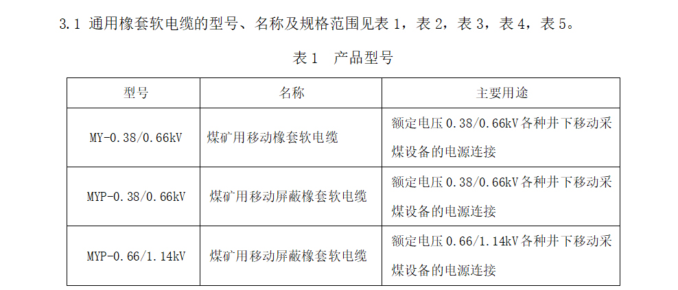 適用于額定電壓U0/U為0.66/1.14kV及以下煤礦移動設(shè)備用銅芯軟電纜。