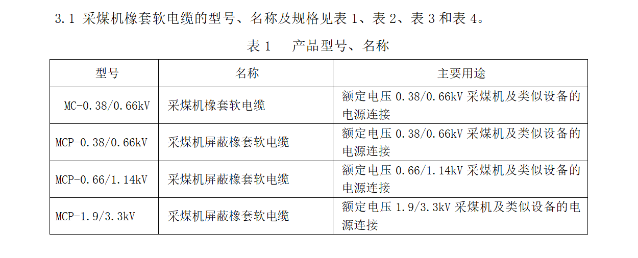 適用于額定電壓U0/U為1.9/3.3kV及以下采煤機軟電纜。